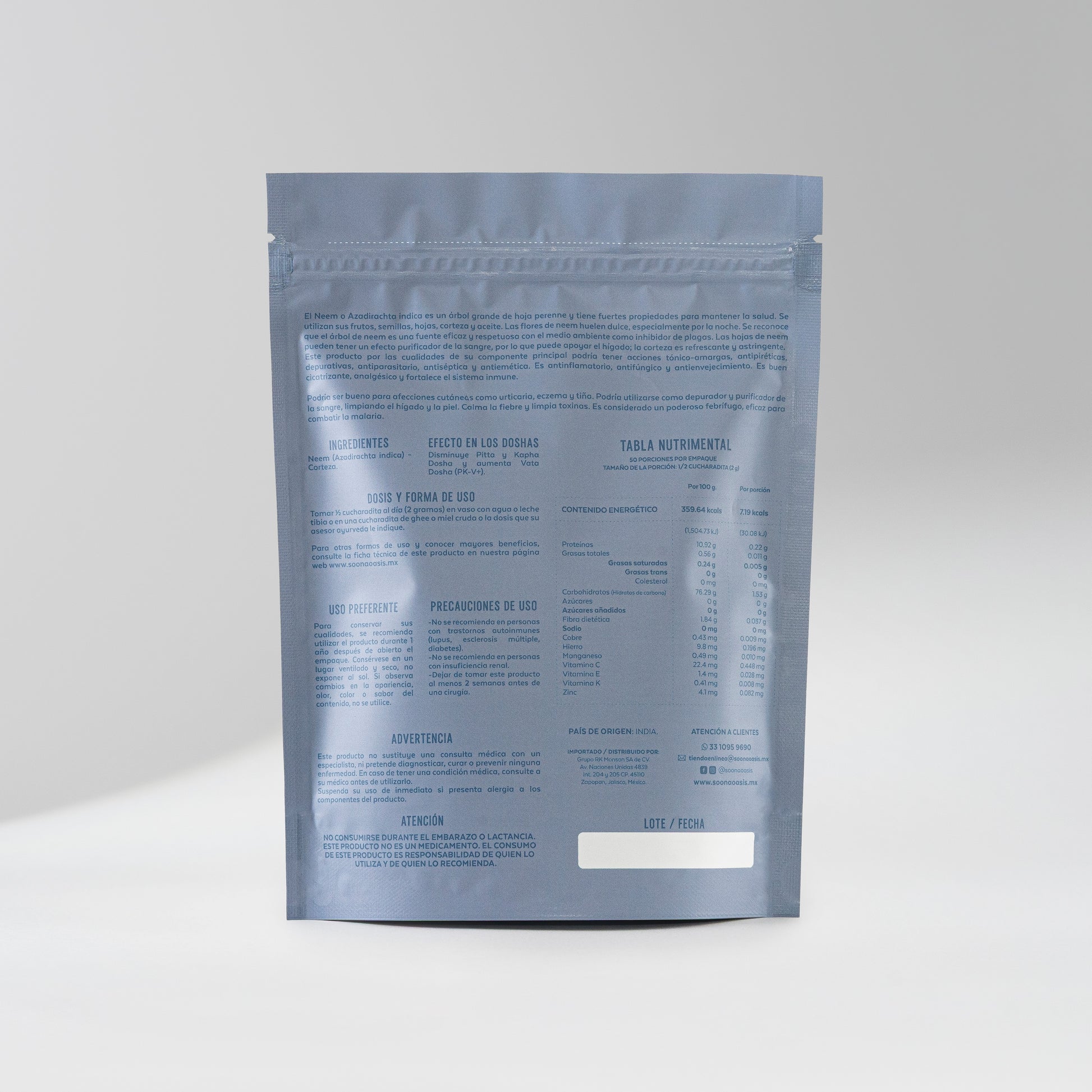 El Neem en polvo de Soona Oasis proviene de un árbol de hoja perenne originario de la India, considerado sagrado dentro de la medicina ayurvédica por su capacidad para apoyar la salud en múltiples niveles. Tradicionalmente se aprovechan sus hojas, corteza, semillas y flores; en esta presentación se utiliza la corteza de Neem, reconocida por su cualidad refrescante, astringente y su alto valor medicinal.
